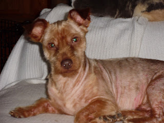 This is Buddy - our "first born" lol. He's a yorkie and was born 2/8/2006. This is after a REALLY short cut from my husband.